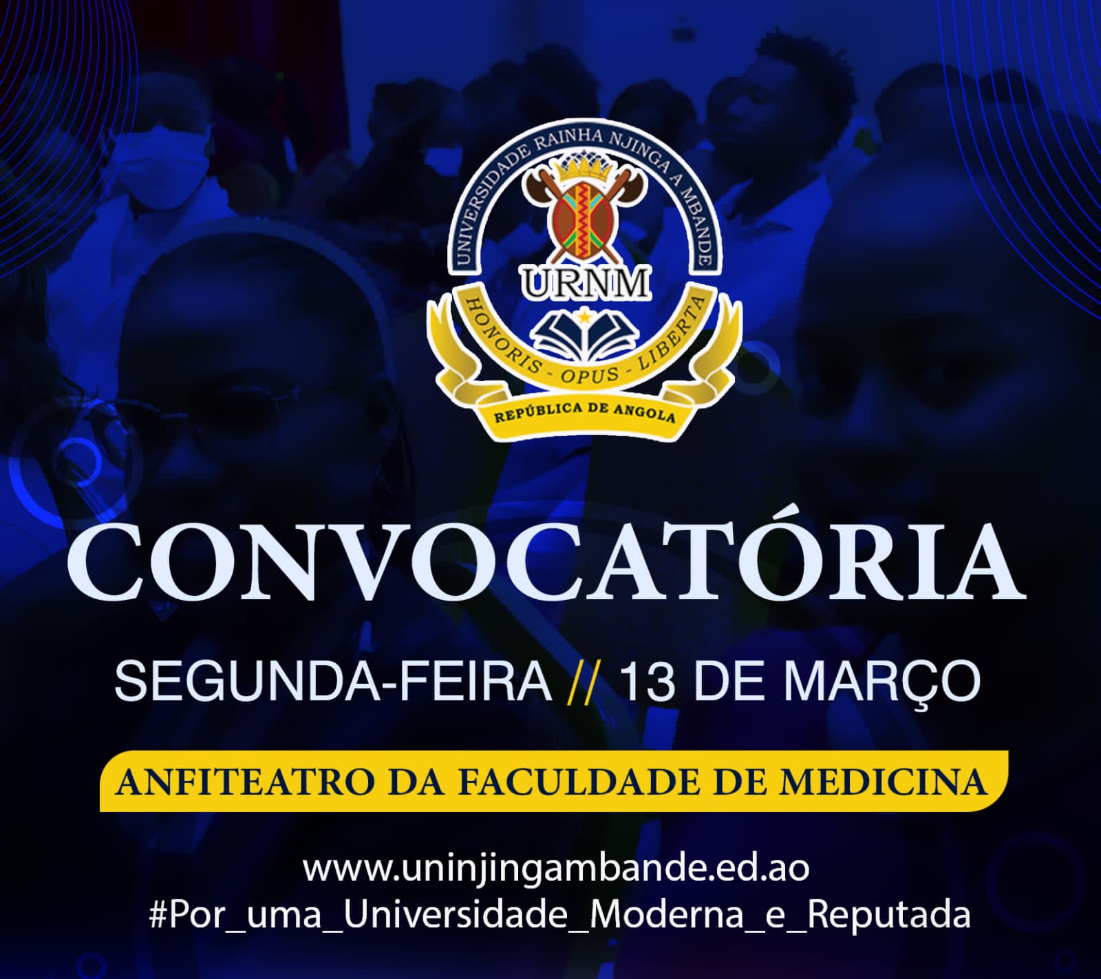 A Coordenação da Comissão de Finalistas do Instituto Politécnico da Universidade Rainha Njinga a Mbande vem, por intermédio desta, convocar os Estudantes Finalistas para uma reunião de carácter informativo. A aludida reunião realizar-se-á na próxima segunda-feira, 13 de Março, pelas 14h 30 minutos, no auditório da Faculdade de Medicina, com a seguinte agenda de trabalho:...Read More