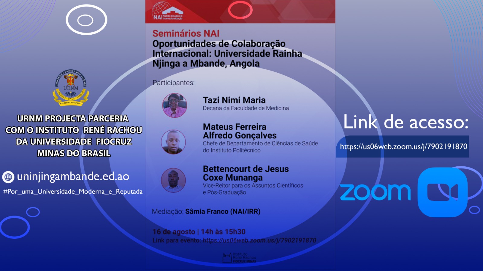 A Universidade Rainha Njinga a Mbande, através da sua Faculdade de Medicina, projecta um memorando de cooperação com o Instituto René Rachou (Fiocruz Minas), localizado no Estado de Minas Gerais, Brasil.Iniciação científica, Brasil, com enfoque nas Ciências da Saúde, bem como a Investigação Científica e Pós-Graduação. Para chegar a tal desiderato, foram considerados alguns elementos...Read More