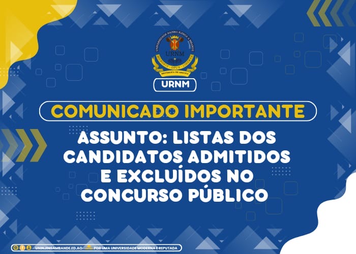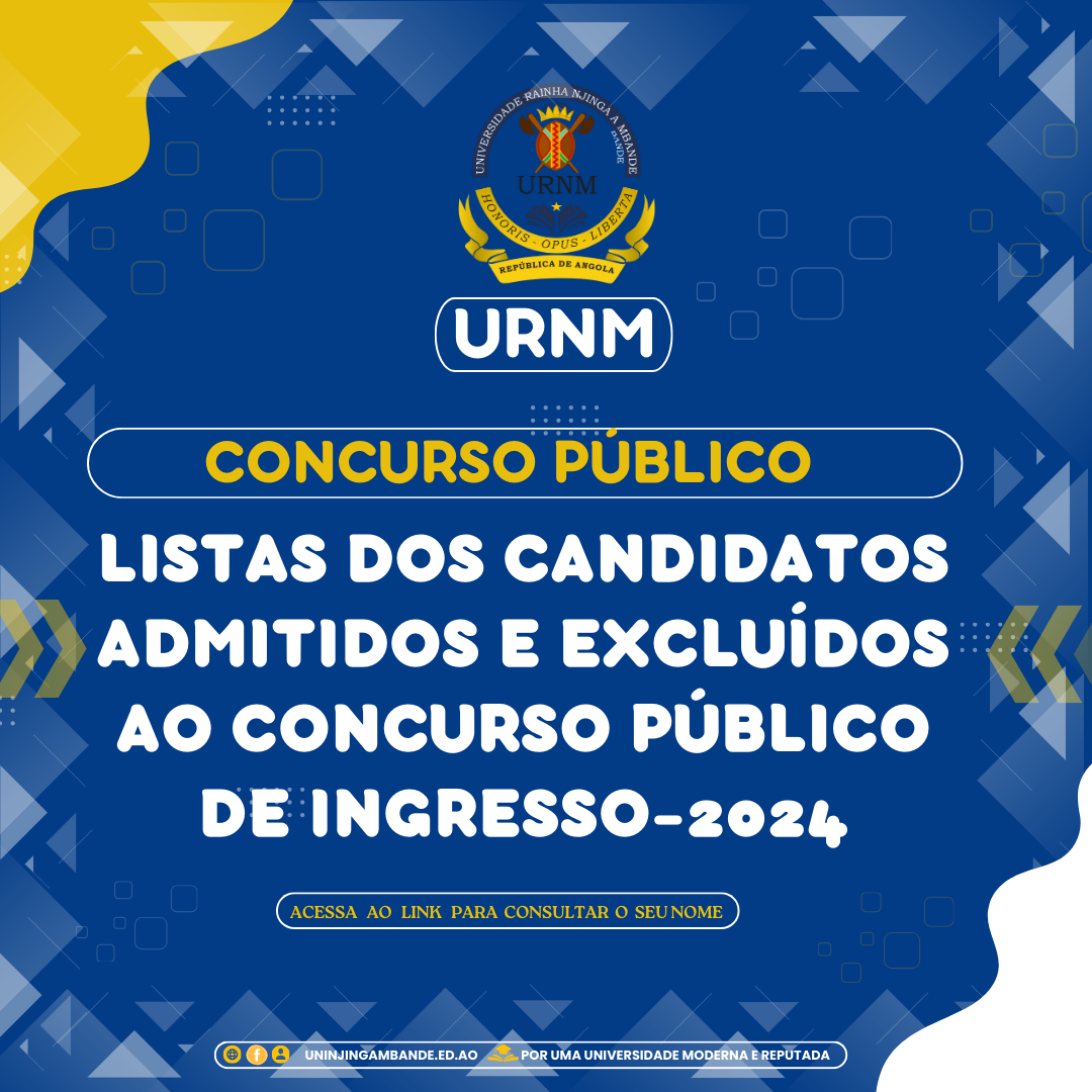 Caros candidatos, membros da Comunidade Académica e público em geral, A Reitoria da Universidade Rainha Njinga a Mbande (URNM) informa que as listas dos candidatos admitidos e excluídos para o Concurso Público de Ingresso -2024 já estão disponíveis para consulta. Importa referir que, de acordo o cronograma, a reclamações sobre as listas públicadas são de...Read More