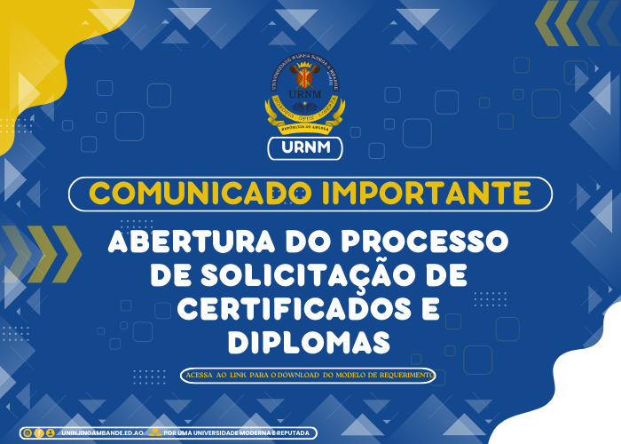 Estimados finalistas do ano lectivo 2023-2024, a Direcção dos Assuntos Académicos da Universidade Rainha Njinga a Mbande informa que o Processo de Solicitação de Certificados e Diplomas já está aberto. As solicitações dos documentos mencionados estarão disponíveis no período de 18 de Julho a 02 de Setembro. Segue a lista dos documentos necessários para o...Read More