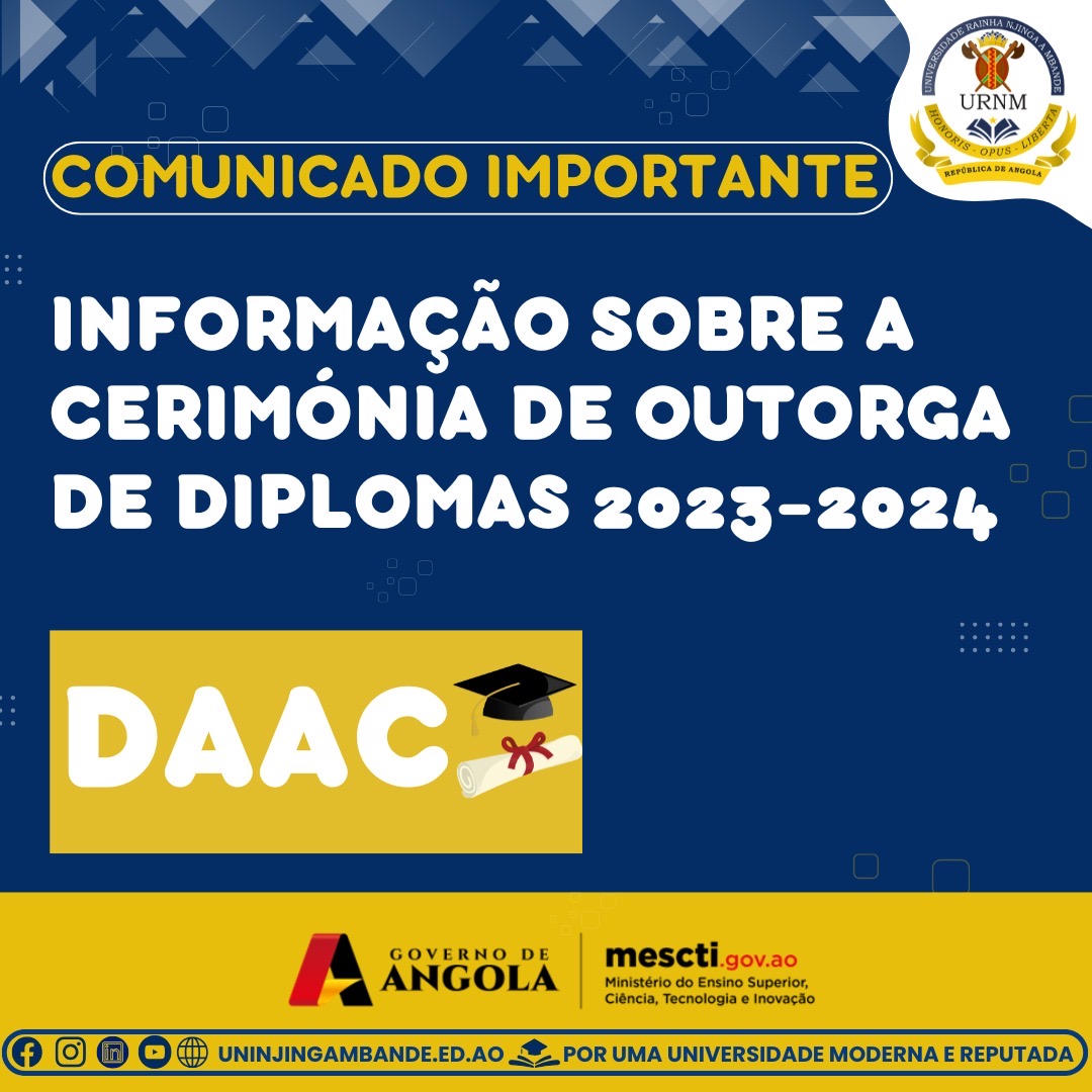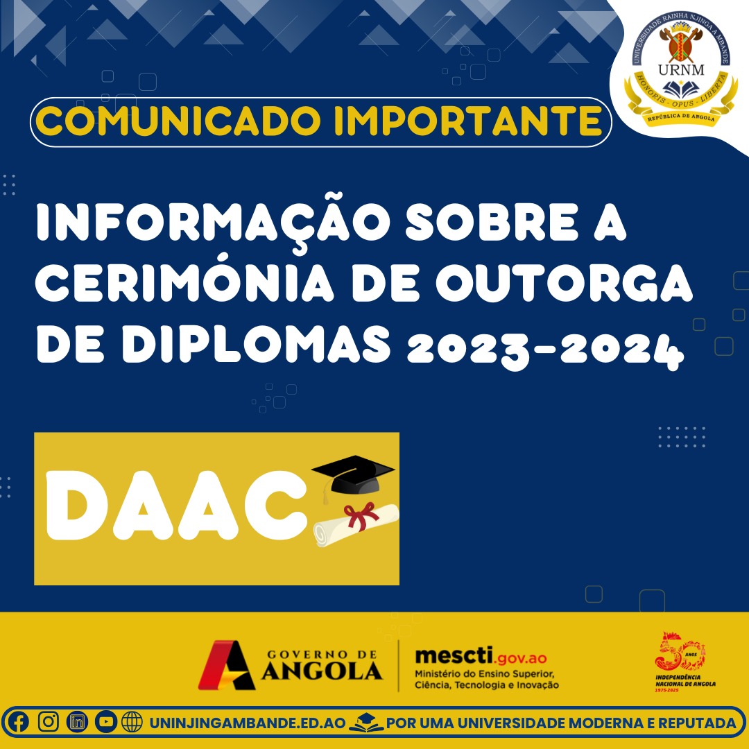 A Direcção dos Assuntos Académicos da URNM informa a toda a Comunidade Académica, em especial aos estudantes finalistas, que, na sequência do comunicado emitido pelo Gabinete de Apoio à Reitoria, a Cerimónia de Outorga de Diplomas referente ao ano académico 2023–2024 terá lugar no dia 30 de Maio de 2025, no Instituto de Tecnologia Agro-Alimentar....Read More