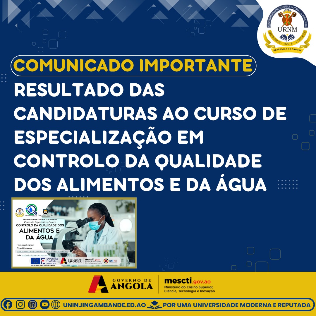 Caros candidatos, membros da Comunidade Académica e público em geral, A Reitoria da Universidade Rainha Njinga a Mbande (URNM), através da Coordenação do Curso, informa que os resultados das candidaturas ao Curso de Especialização em Controlo da Qualidade dos Alimentos e da Água já se encontram disponíveis para consulta. Agradecemos a todos os candidatos pelo...Read More