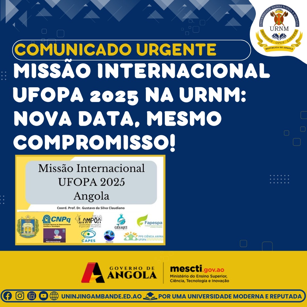 A Universidade Rainha Njinga a Mbande (URNM) informa que, por motivos de força maior e ajustes de agenda, as actividades da Missão Internacional UFOPA 2025 foram reprogramadas para uma nova data única, amanhã, Quarta-feira, 09 de Abril de 2025. Este evento de elevado impacto académico, promovido pela Universidade Federal do Oeste do Pará (Brasil), contará...Read More