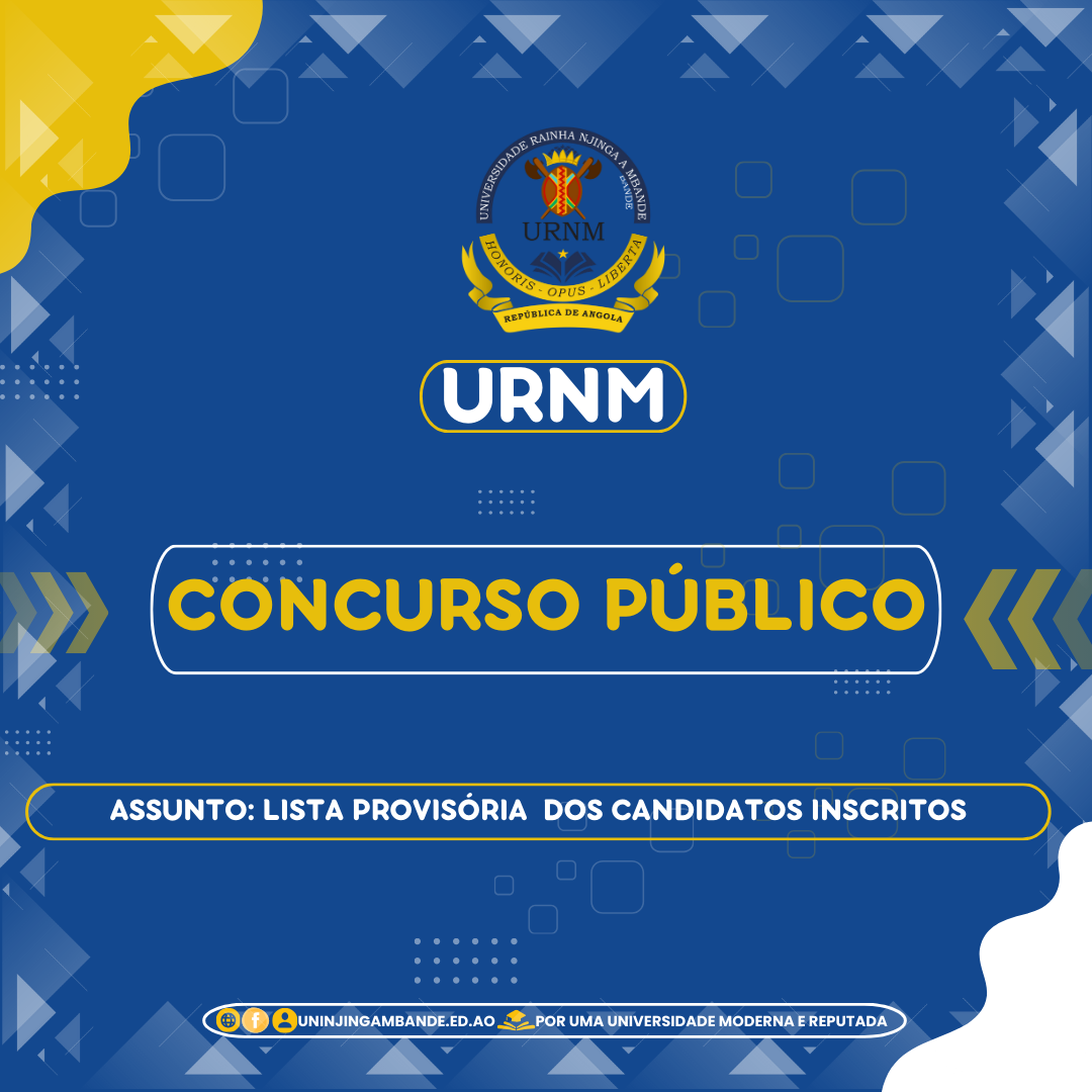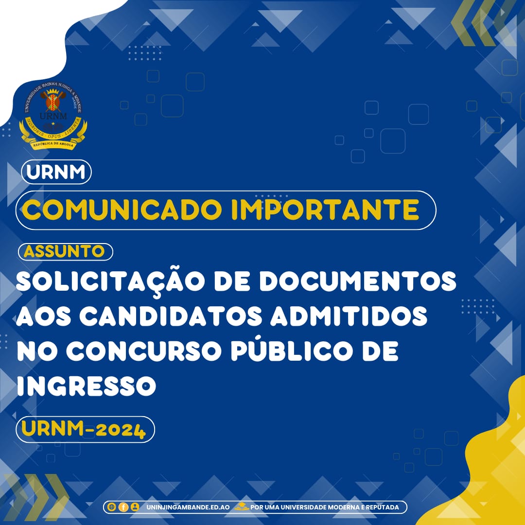 Assunto: Solicitação de Documentos Caros Candidatos, Após a publicação dos resultados finais do Concurso Público de Ingresso para provimento nas Carreiras Docente do Ensino Superior e de Investigador Científico, nas Unidades Orgânicas da Universidade Rainha Njinga a Mbande (URNM), vimos, por meio deste, solicitar que os candidatos admitidos apresentem, em formato físico, os documentos indicados...Read More
